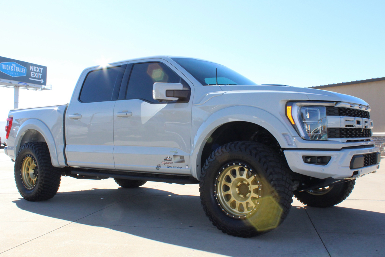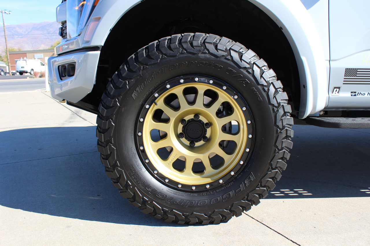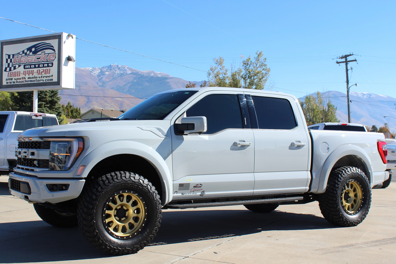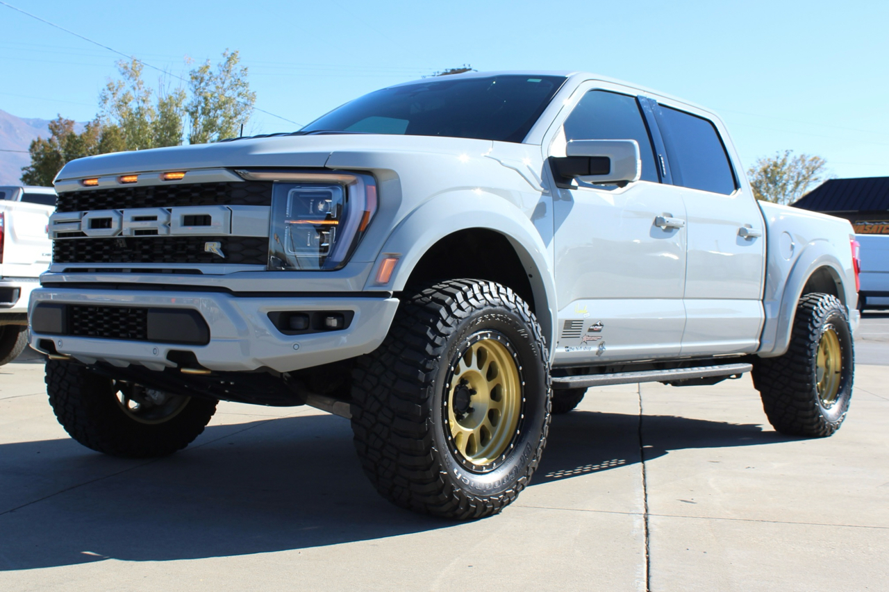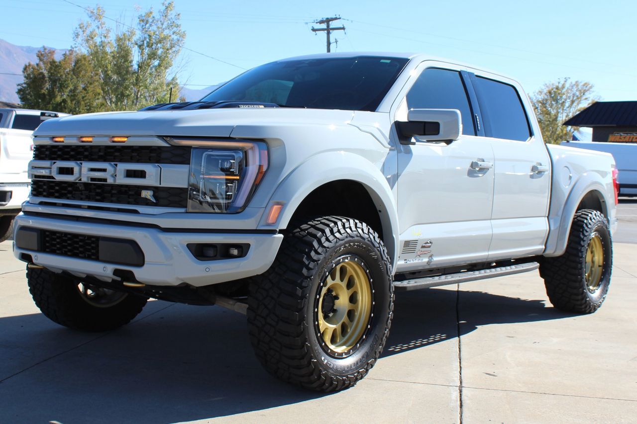 You may need a moment to check your pulse! If this doesn't elevate your heart rate you are probably dead! Just finished and absolutely stunning! This is one of the Baddest Raptors we have built or even seen, (if we do say so ourselves)…. and we have seen and built a lot of them! After a very painful long wait we finally got our hands on this R. Some of the subtle and not so subtle changes are.... 20"x10" Method 315 wheels finished Gold with a gloss black wheel lip, mounted on BFG KM3 Mud Terrain 37"x13.50 R 20 tires, and a RPG 1.5" front spacer make up the stance. We then color matched and custom painted the fender flares, flare extensions, grill, side vents, hood bulge, rear tailgate applique, proximity sensors, emblems, and both front and rear bumpers. We also added a full custom installed bedrug, Molle organizing panel, and a MX4 Bakflip bed cover. To finish up the exterior we tinted all the windows with 3M ceramic tint. Under the hood the 'R" has a TRX killing 5.2 supercharged V8 that makes a healthy 700 Horse Power...well that wasn't good enough so we added a Griptec 2.45 blower pulley to help make more boost at our elevation. Lastly we spent over 30 hours correcting the factory paint and then ceramic coating the entire truck even including the wheels! Not one detail in this build was over looked... notice the matching gold hooks, 'R' emblems, and custom painted tailgate applique.