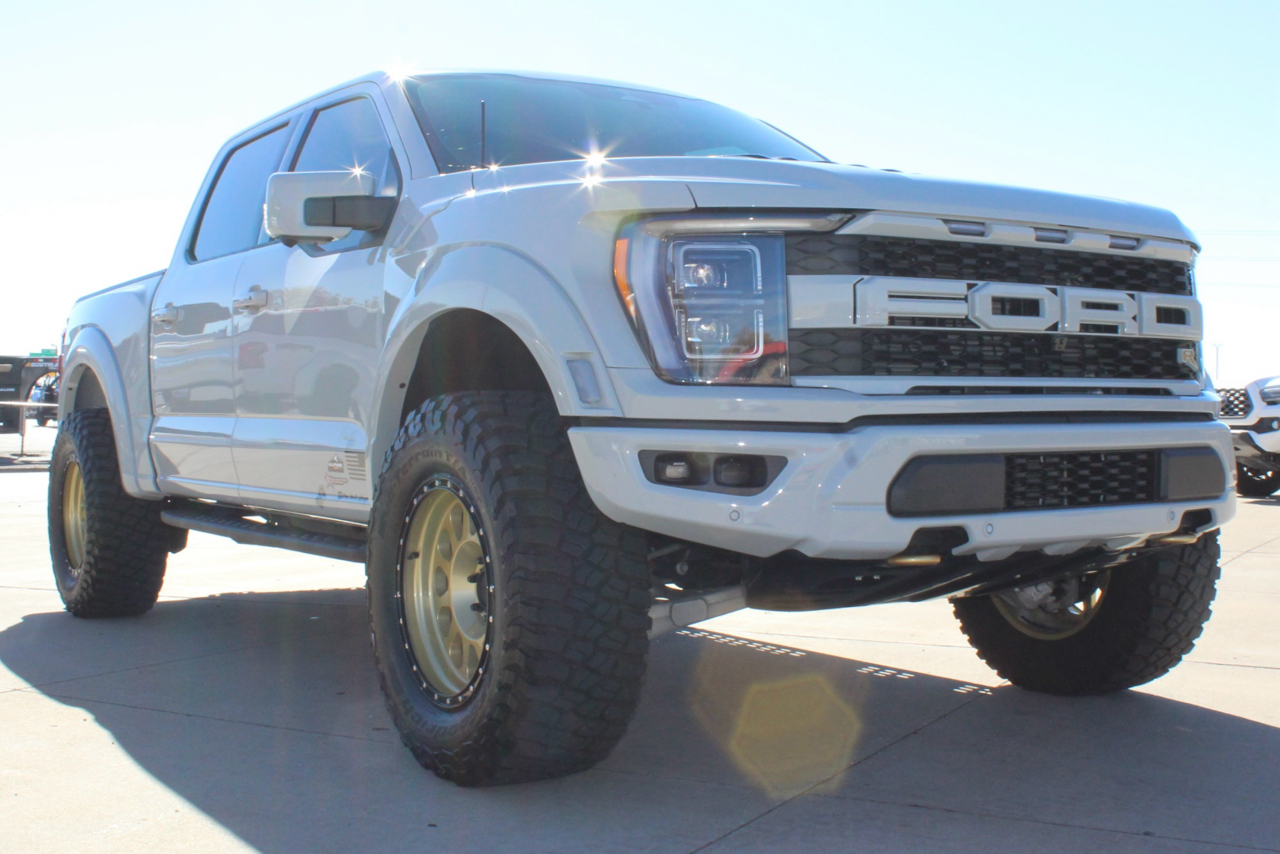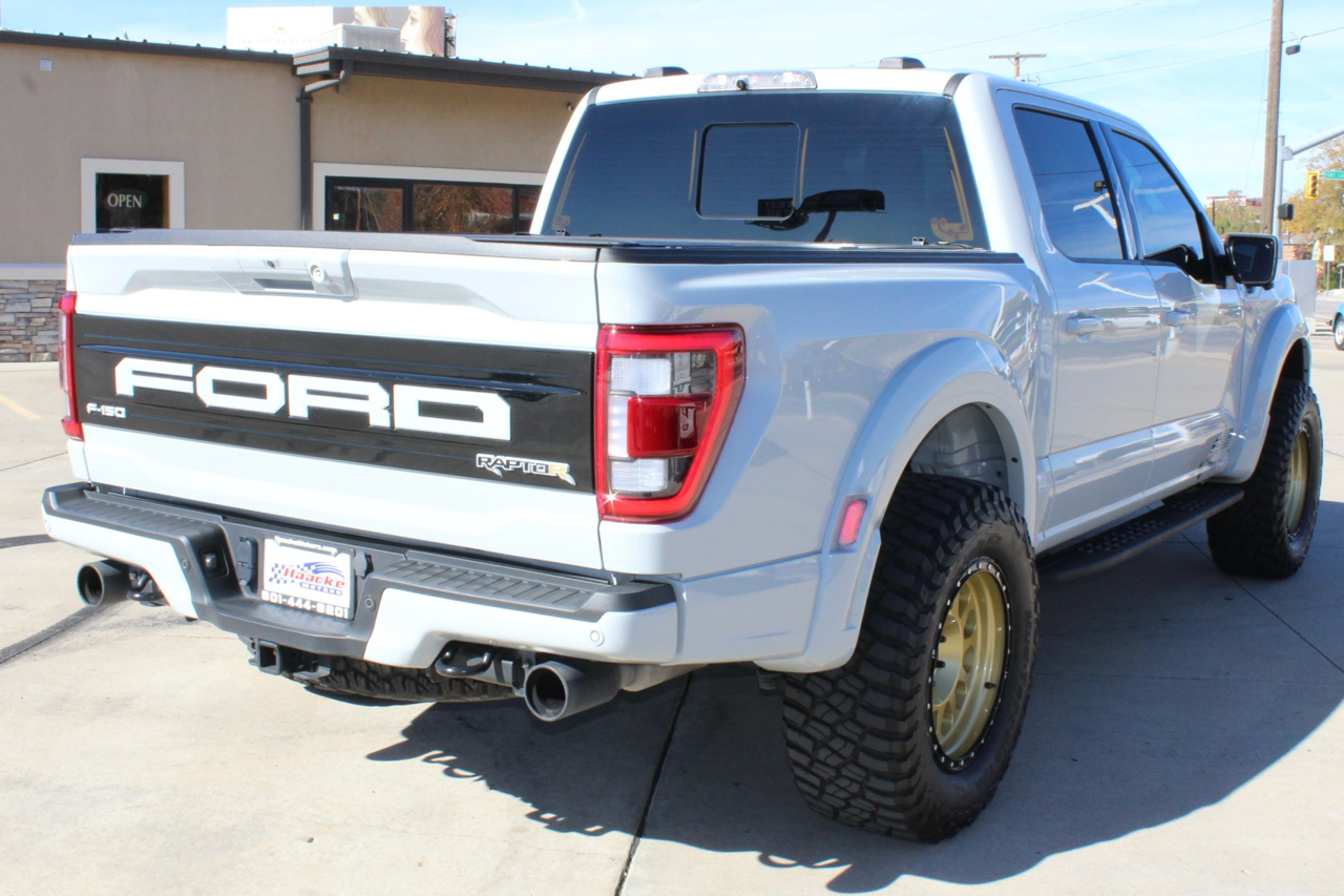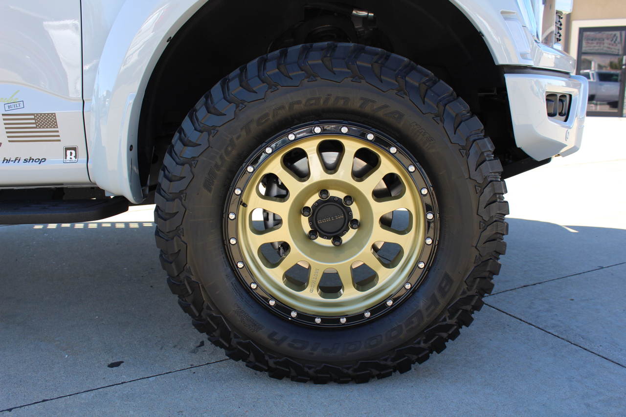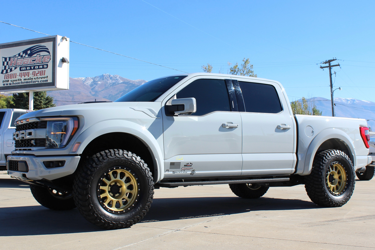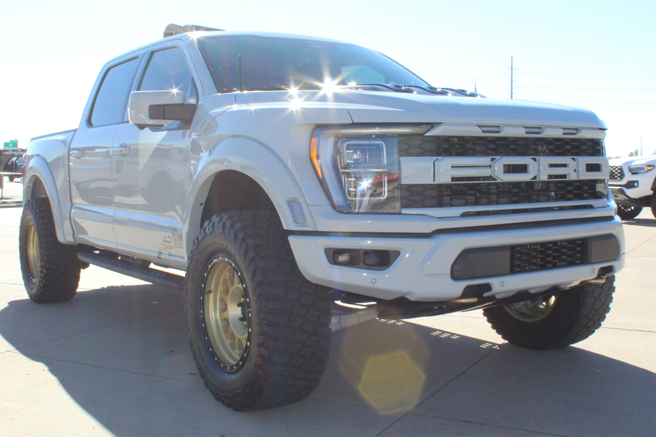 You may need a moment to check your pulse! If this doesn't elevate your heart rate you are probably dead! Just finished and absolutely stunning! This is one of the Baddest Raptors we have built or even seen, (if we do say so ourselves)…. and we have seen and built a lot of them! After a very painful long wait we finally got our hands on this R. Some of the subtle and not so subtle changes are.... 20"x10" Method 315 wheels finished Gold with a gloss black wheel lip, mounted on BFG KM3 Mud Terrain 37"x13.50 R 20 tires, and a RPG 1.5" front spacer make up the stance. We then color matched and custom painted the fender flares, flare extensions, grill, side vents, hood bulge, rear tailgate applique, proximity sensors, emblems, and both front and rear bumpers. We also added a full custom installed bedrug, Molle organizing panel, and a MX4 Bakflip bed cover. To finish up the exterior we tinted all the windows with 3M ceramic tint. Under the hood the 'R" has a TRX killing 5.2 supercharged V8 that makes a healthy 700 Horse Power...well that wasn't good enough so we added a Griptec 2.45 blower pulley to help make more boost at our elevation. Lastly we spent over 30 hours correcting the factory paint and then ceramic coating the entire truck even including the wheels! Not one detail in this build was over looked... notice the matching gold hooks, 'R' emblems, and custom painted tailgate applique.