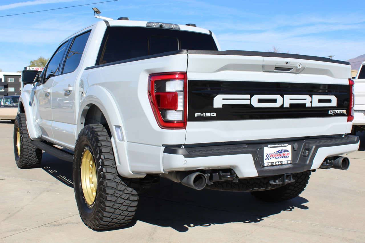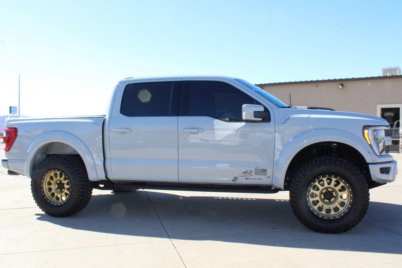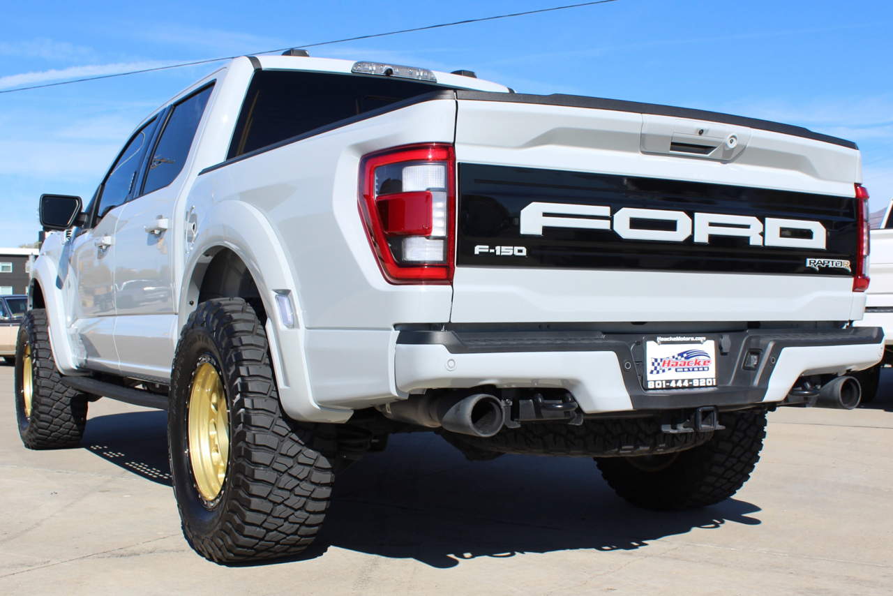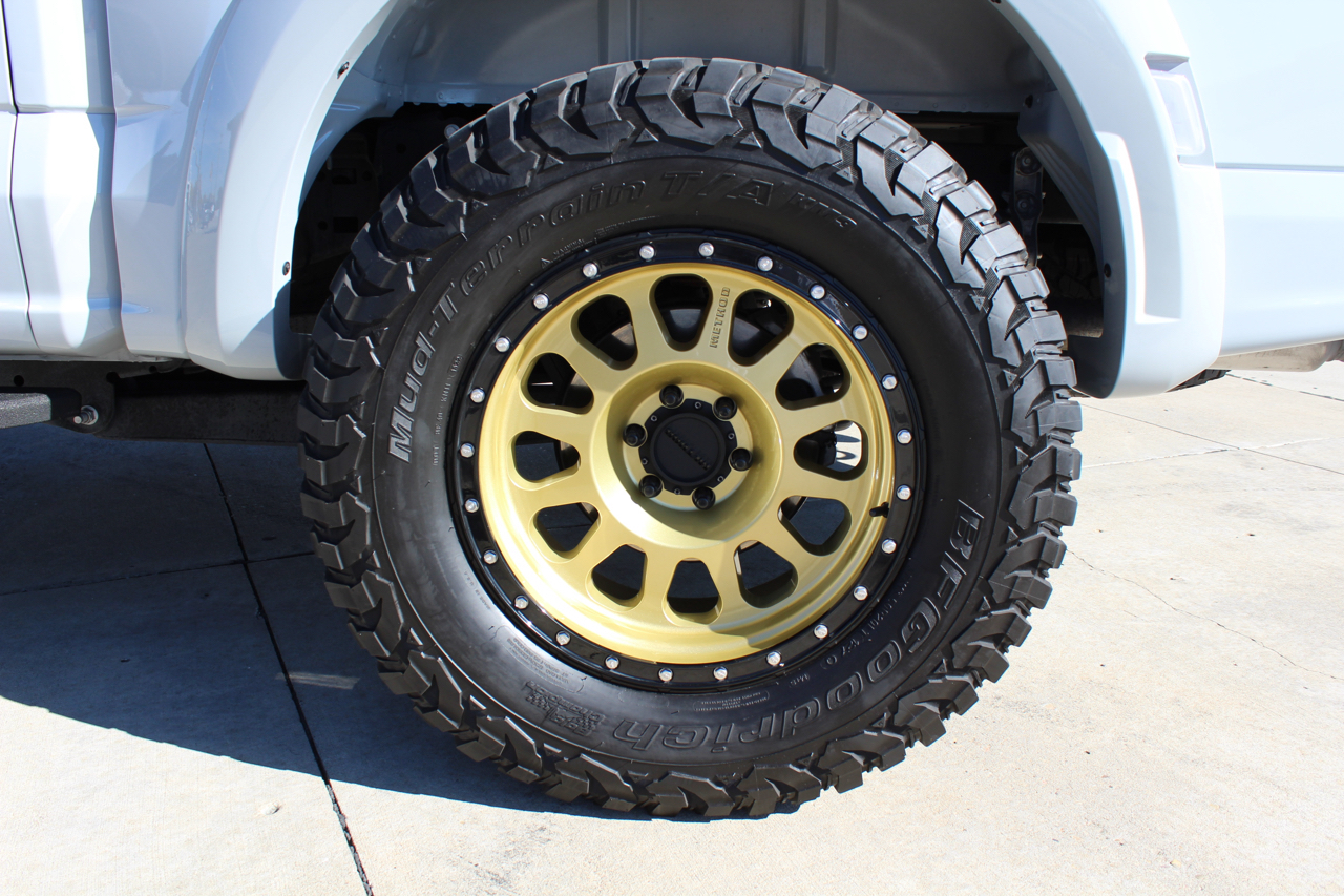 You may need a moment to check your pulse! If this doesn't elevate your heart rate you are probably dead! Just finished and absolutely stunning! This is one of the Baddest Raptors we have built or even seen, (if we do say so ourselves)…. and we have seen and built a lot of them! After a very painful long wait we finally got our hands on this R. Some of the subtle and not so subtle changes are.... 20"x10" Method 315 wheels finished Gold with a gloss black wheel lip, mounted on BFG KM3 Mud Terrain 37"x13.50 R 20 tires, and a RPG 1.5" front spacer make up the stance. We then color matched and custom painted the fender flares, flare extensions, grill, side vents, hood bulge, rear tailgate applique, proximity sensors, emblems, and both front and rear bumpers. We also added a full custom installed bedrug, Molle organizing panel, and a MX4 Bakflip bed cover. To finish up the exterior we tinted all the windows with 3M ceramic tint. Under the hood the 'R" has a TRX killing 5.2 supercharged V8 that makes a healthy 700 Horse Power...well that wasn't good enough so we added a Griptec 2.45 blower pulley to help make more boost at our elevation. Lastly we spent over 30 hours correcting the factory paint and then ceramic coating the entire truck even including the wheels! Not one detail in this build was over looked... notice the matching gold hooks, 'R' emblems, and custom painted tailgate applique.