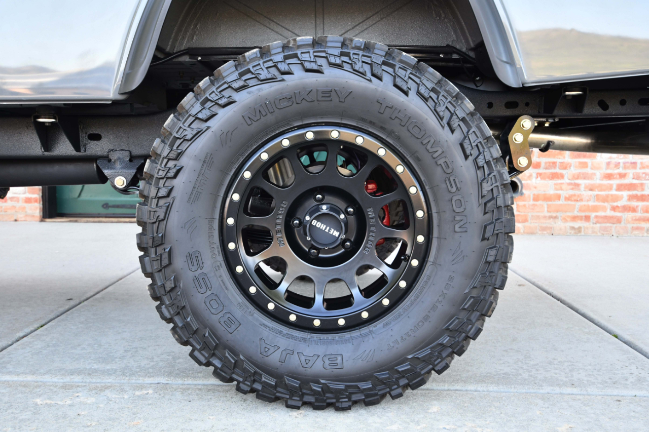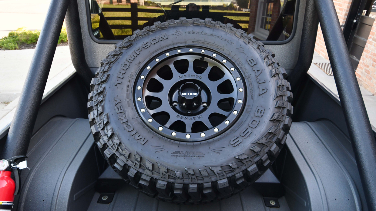 Matte black 17? Method 305 wheels are mounted with 35×12.5? Mickey Thompson Baja Boss tires, and a matching spare is secured to a bed-mounted Rough Country tire carrier. The Jeep features manually locking front hubs, power steering, and a Fox steering stabilizer and shocks.